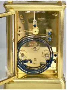 To set the clock, most carriage clocks have a hand setting arbour located in the middle of the back plate. Place the rear end of the winding key over the arbour and move the hands gently round the clock to the correct time. If you have a striking carriage clock, make sure that when you turn the hands allow each hourly strike to finish its sequence to avoid the strike mechanism jamming. If the hands lock do not force them. Turn the hands back a minute or so only and allow the chime to finish and then gently move the hands on. Please remember that the hands should not be turned back more than 3 to 4 minutes as this will damage the levers that trigger the strike mechanism.
